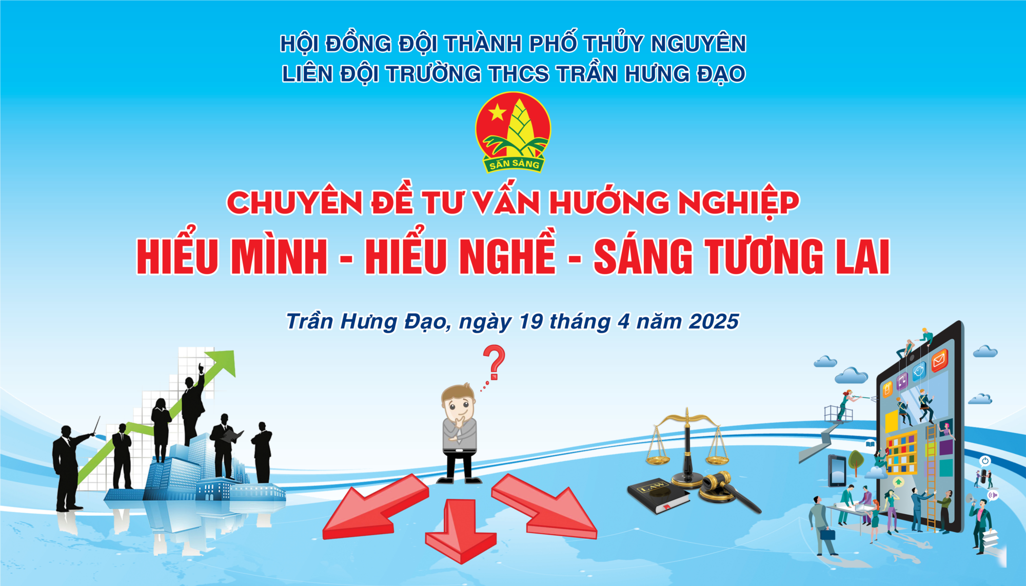 Thực hiện chương trình công tác Đội và phong trào thiếu nhi năm học 2024-2025, được sự đồng ý của Chi bộ, Ban giám hiệu nhà trường, sáng ngày 19/4/2025, tại Nhà văn hóa đa năng phường Trần Hưng Đạo, Liên Đội trường THCS Trần Hưng Đạo đã tổ chức thành công Chuyên đề cấp huyện Tư vấn Hướng nghiệp với chủ đề: “Hiểu mình - Hiểu nghề - Sáng tương lai”.