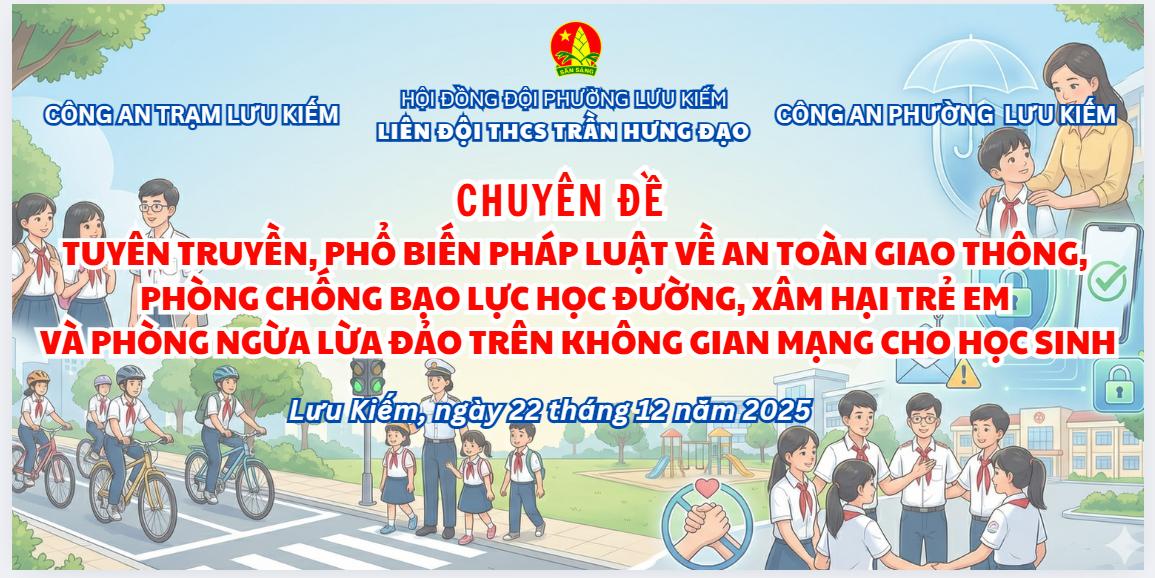 Thực hiện kế hoạch năm học và chương trình công tác Đội và phong trào thiếu nhi năm học 2025 – 2026, chiều ngày 22/12/2925 Liên đội trường THCS Trần Hưng Đạo đã tổ chức thành công chuyên đề: “Tuyên truyền, phổ biến pháp luật về ATGT, phòng chống bạo lực học đường, xâm hại trẻ em và phòng ngừa lừa đảo trên không gian mạng”.