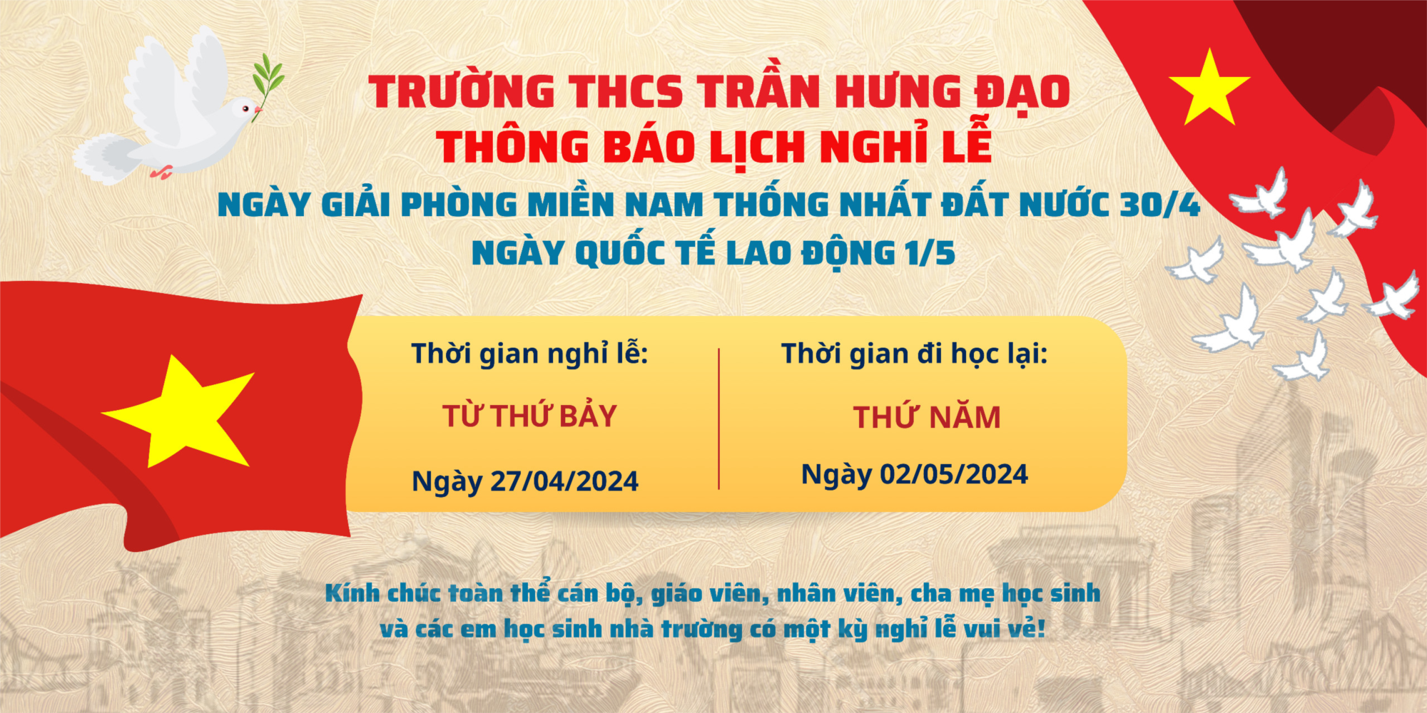 LỊCH NGHỈ LỄ 30/4, 1/5 NĂM 2024