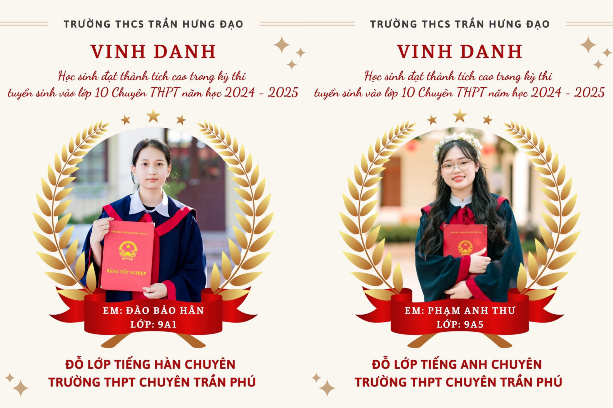 Vinh dự và tự hào nhà trường đã có 02 học sinh trúng tuyển vào trường THPT Chuyên Trần Phú trong năm học này đó là: 🔸Em: Phạm Anh Thư - lớp 9A5 đỗ lớp Tiếng Anh Chuyên 🔸Em: Đào Bảo Hân - lớp 9A1 đỗ lớp Tiếng Hàn Chuyên. Chúc mừng các em, chúc các em ngày càng thành công hơn nữa trên con đường học tập!