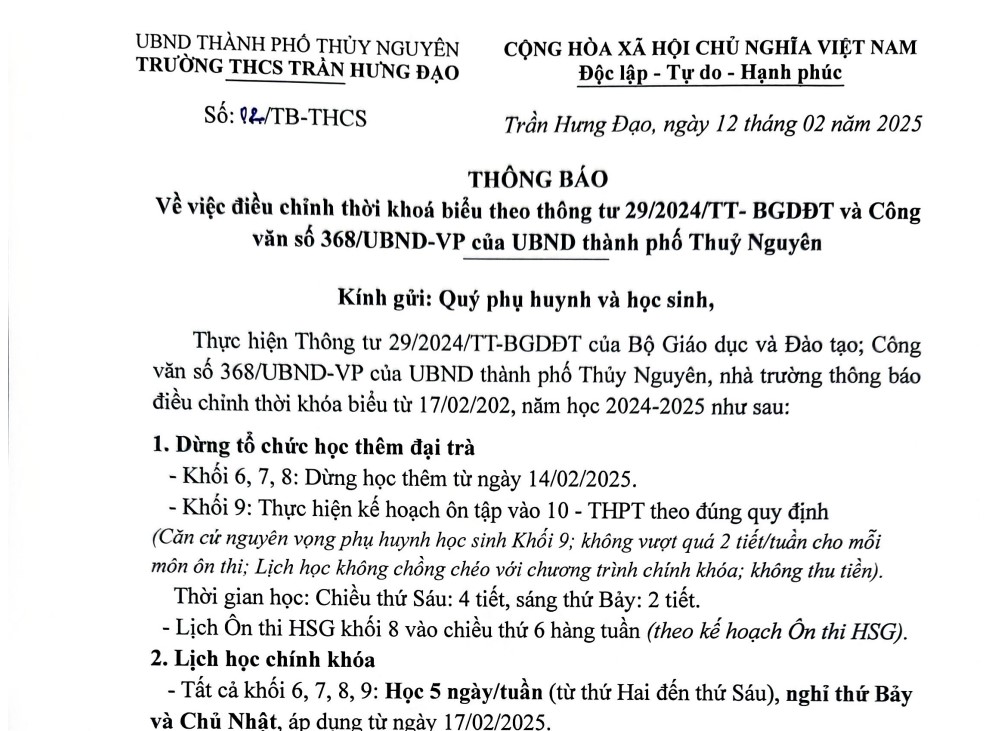 Về việc điều chỉnh thời khoá biểu theo thông tư 29/2024/TT- BGDĐT và Công văn số 368/UBND-VP của UBND thành phố Thuỷ Nguyên