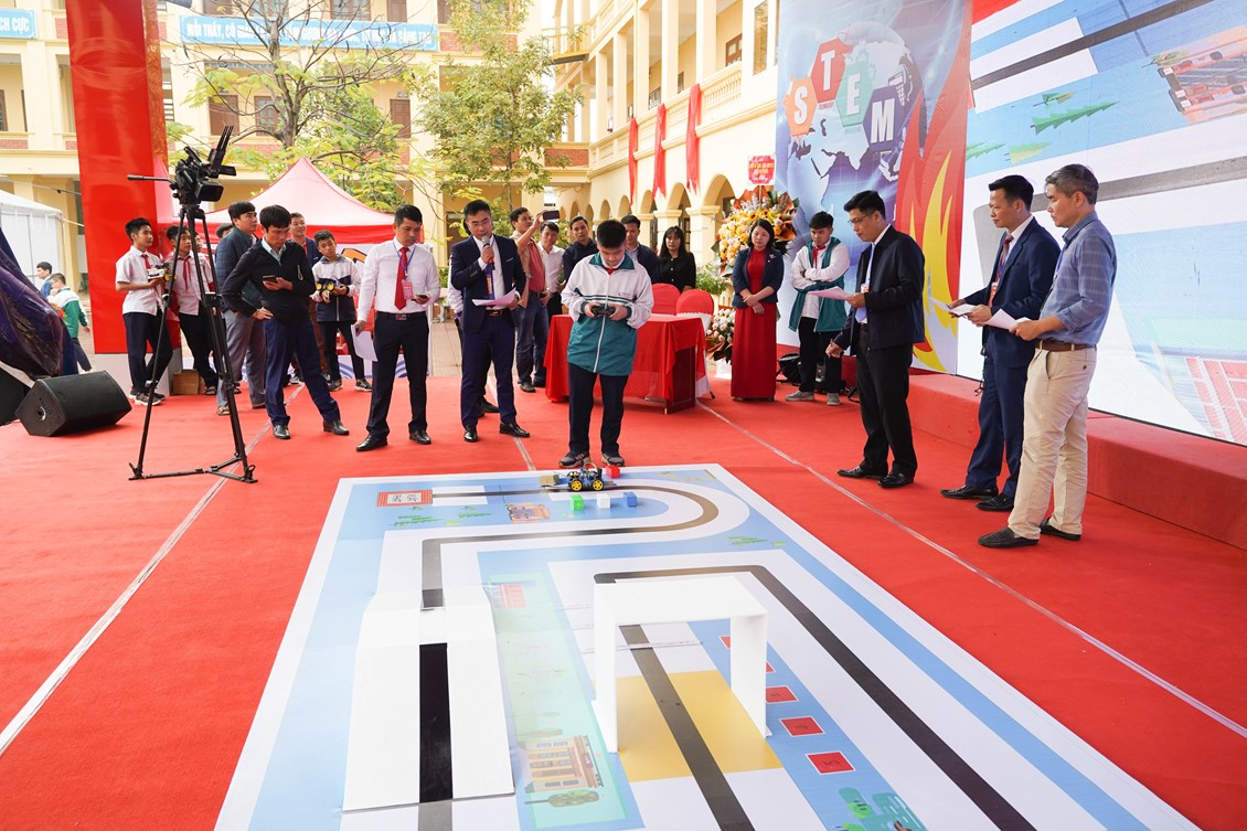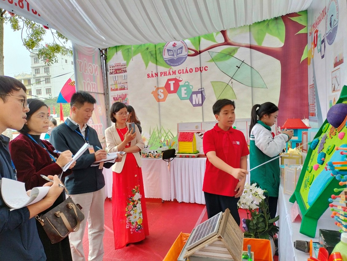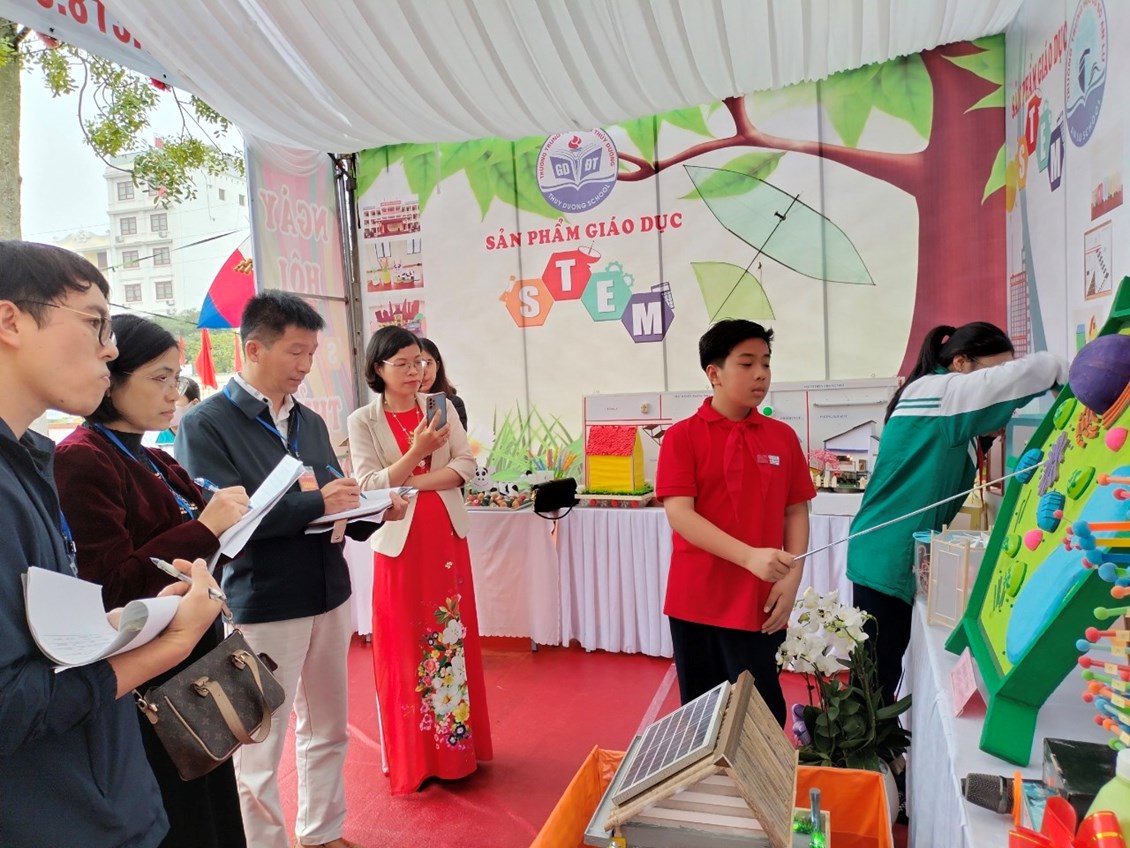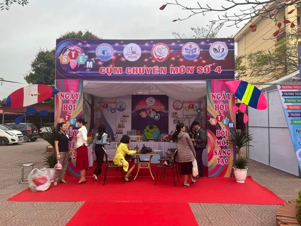 Trường THCS Trần Hưng Đạo tham gia với vai trò đồng tổ chức. - Tham gia gian chưng bày của cụm Chuyên môn số IV; - Tham gia 03 sản phẩm dự thi: 1. Sản phẩm: Máy xay bột nước dạng đứng (Vật lí 9) - Học sinh: Đỗ Hồng Quân; Bùi Quỳnh Anh lớp 9A1 - Giáo viên hướng dẫn: Vũ Thị Huệ 2. Mô hình ngôi nhà của em (Công nghệ 6 Toán 8 ). - Học sinh: Đào Xuân Trường; Lương Thị Thu Giang; Vũ Tuấn Minh; Bùi Minh Khôi; Lê Vũ Khánh Chi lớp 6A5. - Giáo viên hướng dẫn: Phạm Thị Thanh Dung; Nguyễn Đức Nhã. 3. Mô hình Mô hình cấu tạo tế bào (KHTN 6). - Học sinh: Nguyễn Xuân Tiến (8A1); Nguyễn Thị Minh Tâm (9A1). - Giáo viên hướng dẫn: Nguyễn Thị Phương.