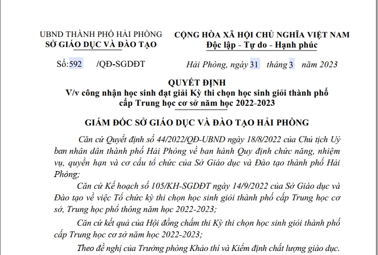 Theo QĐ số 592/QĐ-SGDĐT ngày 31/3/2023 của Sở GD-ĐT về Công nhận học sinh đạt giải Kỳ thi chọn HSG thành phố cấp THCS năm học 2022-2023.