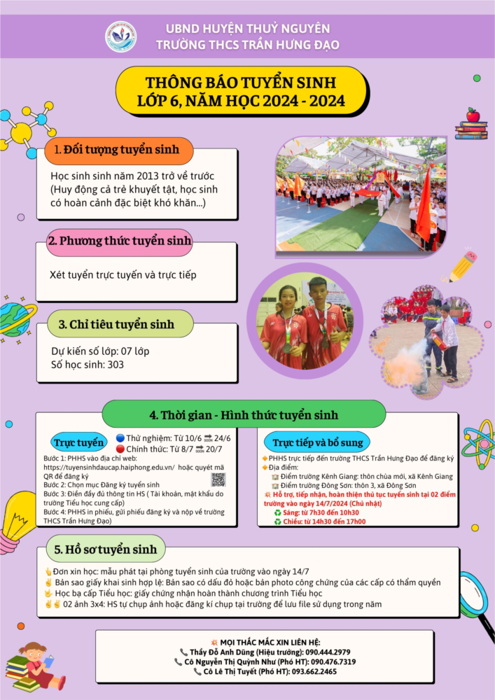 Trường THCS Trần Hưng Đạo thông báo đến toàn thể nhân dân xã Kênh Giang, xã Đông Sơn về việc tuyển sinh lớp 6 năm học 2024 - 2025 như sau: