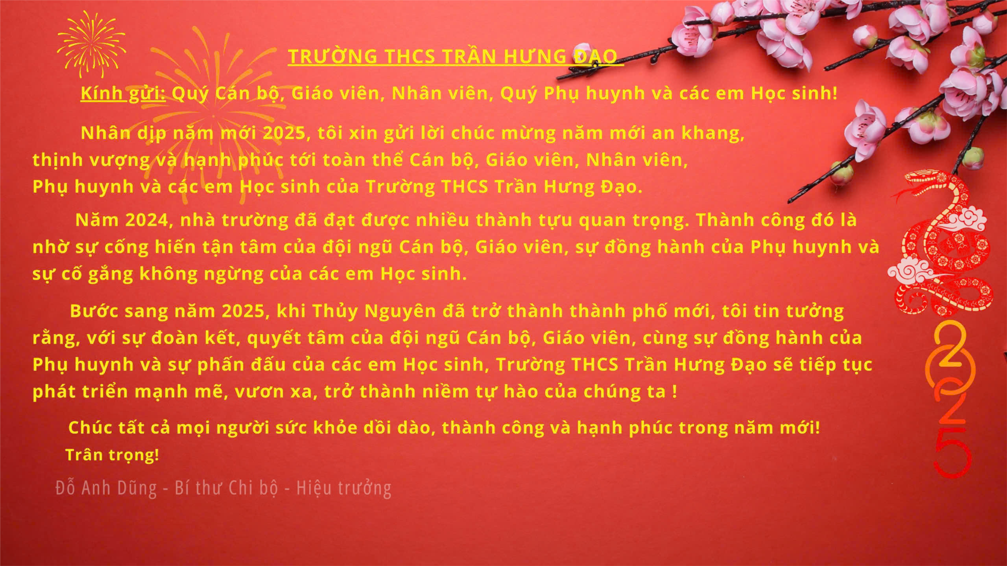 Nhân dịp năm mới 2025, tôi xin gửi lời chúc mừng năm mới an khang, thịnh vượng và hạnh phúc tới toàn thể Cán bộ, Giáo viên, Nhân viên, Phụ huynh và các em Học sinh của Trường THCS Trần Hưng Đạo.