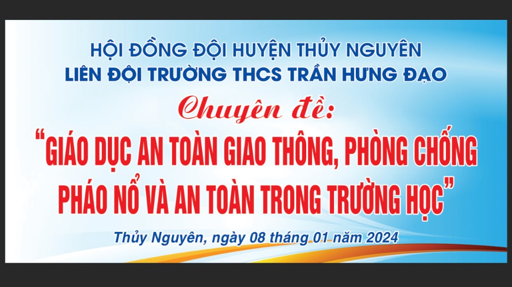 Căn cứ văn bản số: 3729/SGDĐT-VP của sở GD-ĐT ngày 29/12/2023 về việc bảo đảm trật tự ATGT, PCTP, ANTT trong dịp Tết Dương lịch, Tết Nguyên đán Giáp Thìn và Lễ hội Xuân năm 2024 Các văn bản chỉ đạo thực hiện nhiệm vụ giáo dục Trung học cơ sở, năm học 2023-2024 của Phòng Giáo dục và Đào tạo Thủy Nguyên; Căn cứ nhiệm vụ năm học 2023 – 2024 của trường THCS Trần Hưng Đạo; Căn cứ vào tình hình thực tế của nhà trường, trường THCS Trần Hưng Đạo xây dựng kế hoạch tổ chức tuyên truyền, giáo dục về an toàn giao thông, bạo lực học đường và phòng chống ma túy trong trường học năm học 2023 - 2024. + Đại diện công an huyện Thủy Nguyên. Đ/c Trung tá Hoàng Bá Mạnh- Phó đội trưởng Đội CSGT, CA huyện Thủy Nguyên. + Đại diện công an xã Kênh Giang. Đ/c Đào Văn Thuận - Trưởng công an xã Kênh Giang + Ban đại diện CMHS trường.
