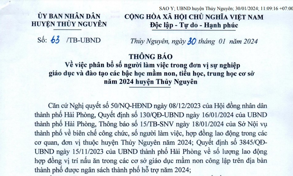 UBND Huyện Thuỷ Nguyên phân bổ số người làm việc trong đơn vi sự nghiệp giáo dục và đào tạo .. năm 2024